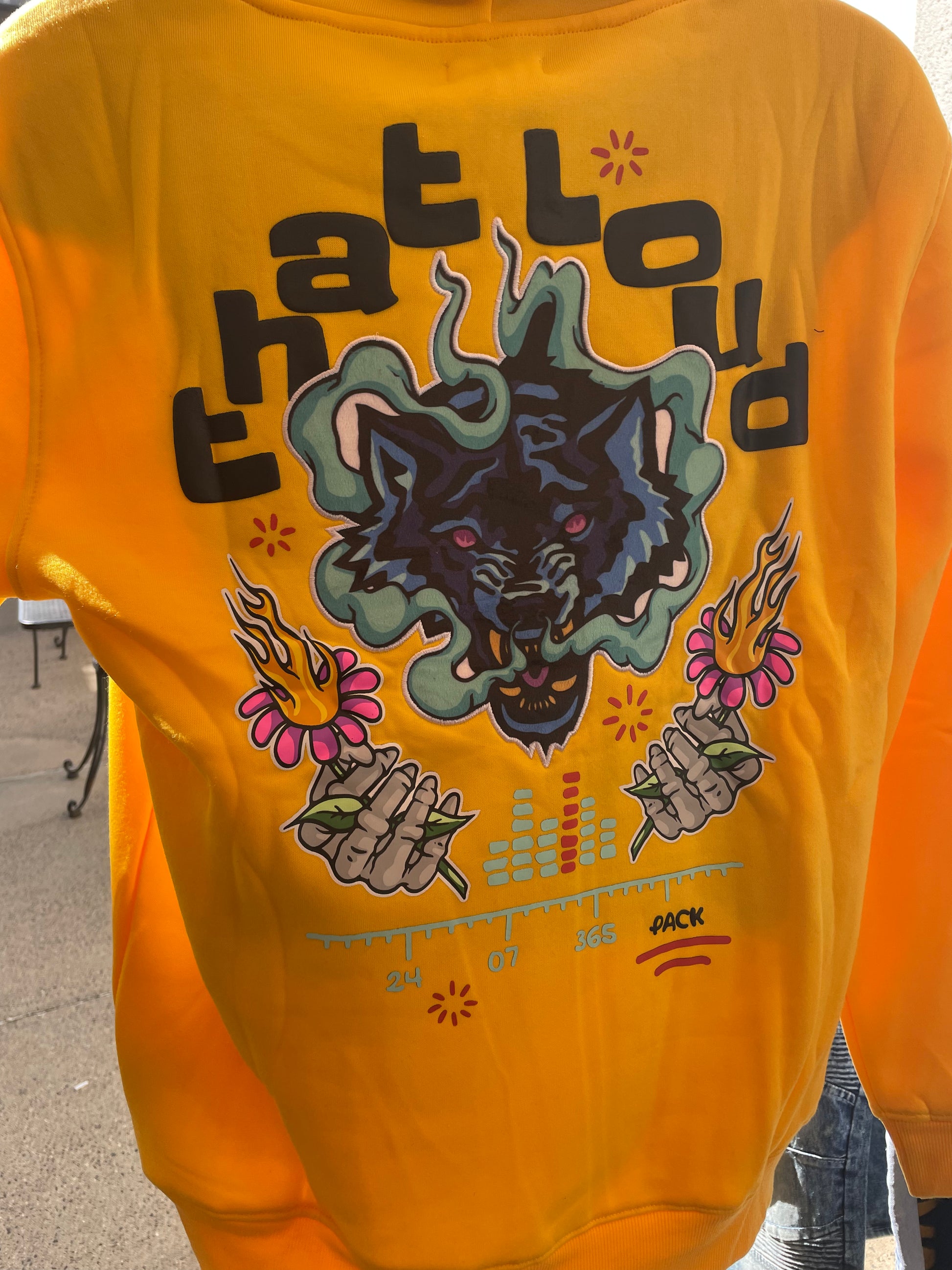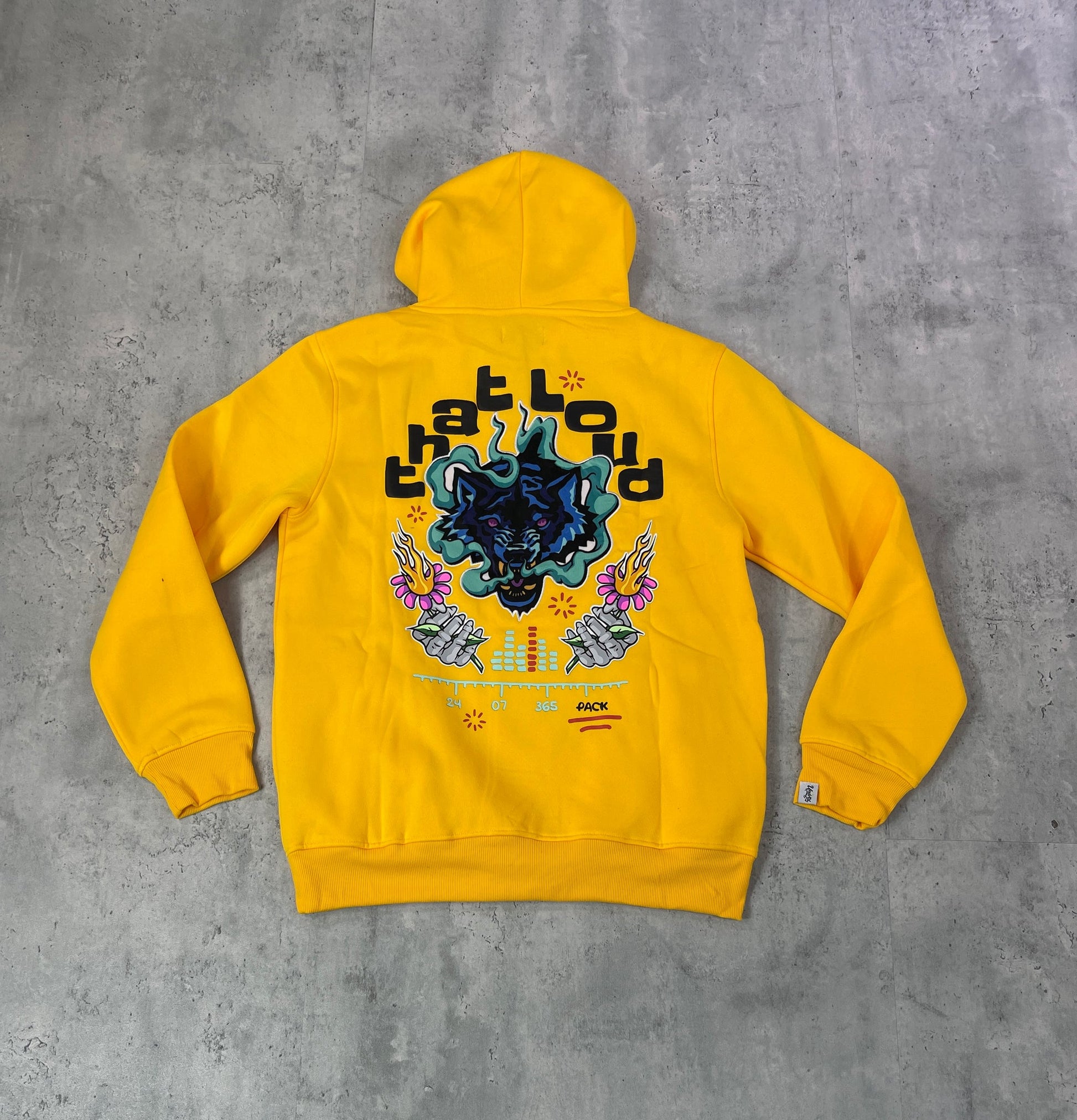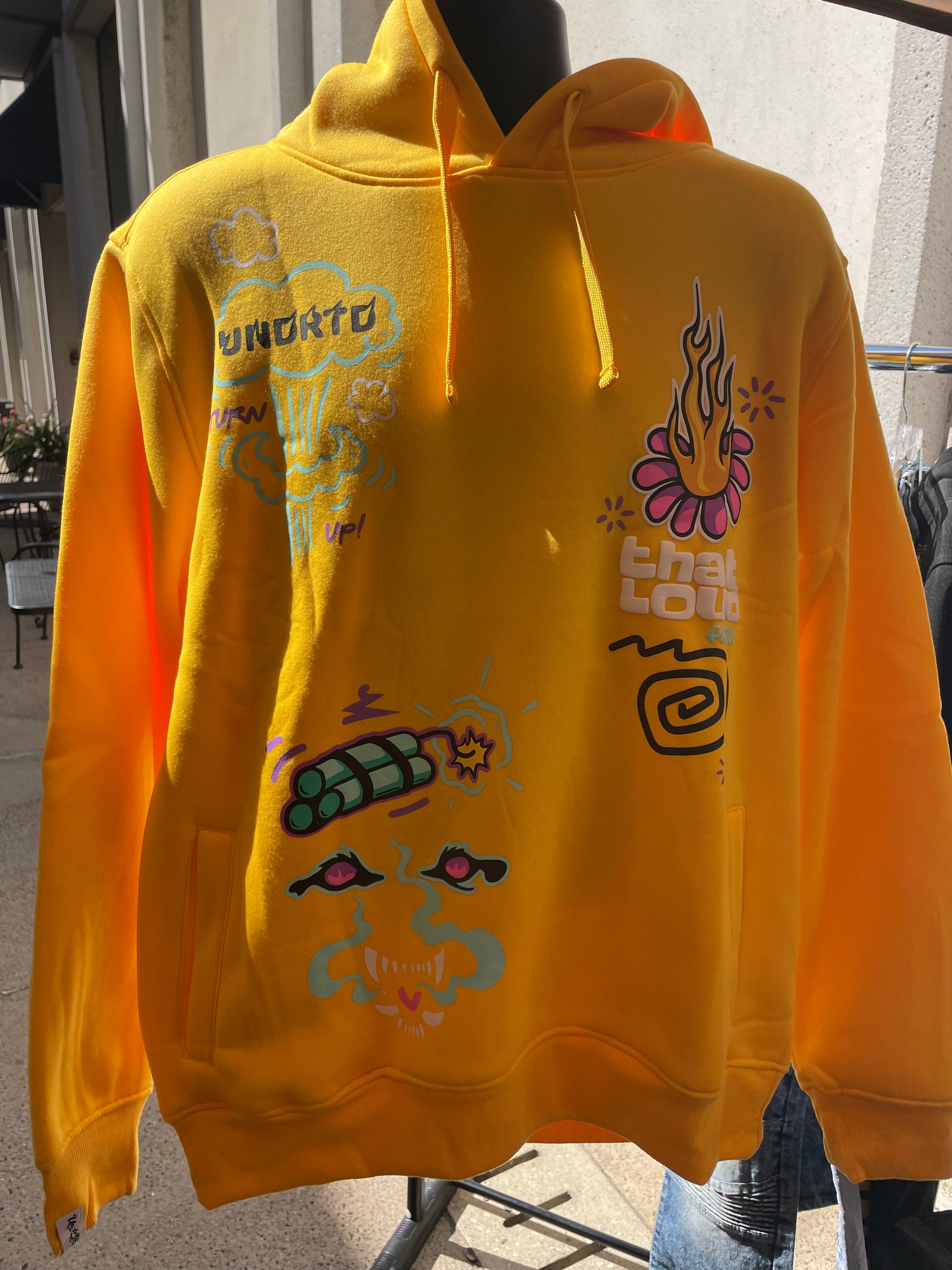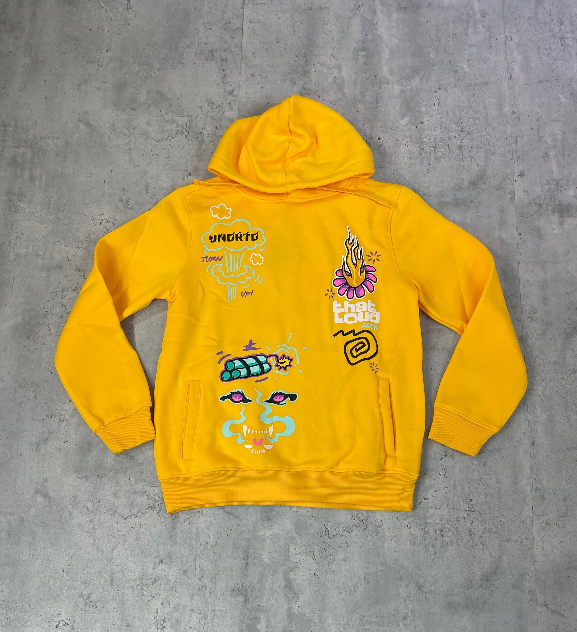Yellow fleece hoody with graphic designs